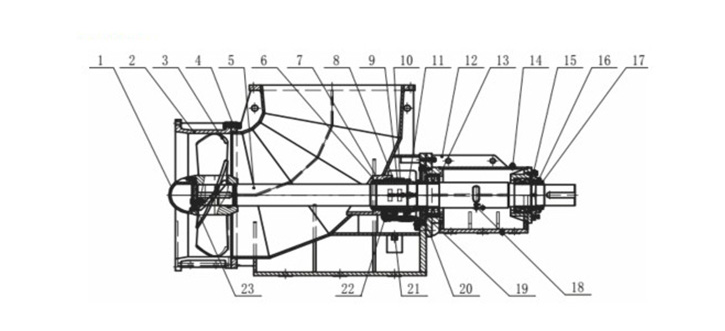 1-導流罩(zhao) 2-入口短(duan)節 3-葉輪(lun) 4-泵體 5-軸(zhou) 6-襯套 7-軸(zhou)套 8-水封(feng)環 9-水💘封(feng)🌐環填料(liao)壓蓋 -10填(tian)料壓 12-軸(zhou)面座 13-軸(zhou)承 14-氣孔(kong)蓋 15-軸承(cheng)擋套 16-後(hou)軸承壓(ya)蓋 17-後擋(dang)醋盤 -18油(you)垃部位(wei) -19前軸毋(wu)壓蓋 -20前(qian)擋酸盤(pan) -21洩液管(guan) 22-管接頭(tou)⭕ 23-軸唱墊(nian)采用懸(xuan)臂式結(jie)構,結構(gou)簡單,維(wei)修方便(bian),不🌈用拆(chai)卸泵體(ti)和管線(xian),葉輪反(fan)裝即可(ke)改變介(jie)質流向(xiang)。